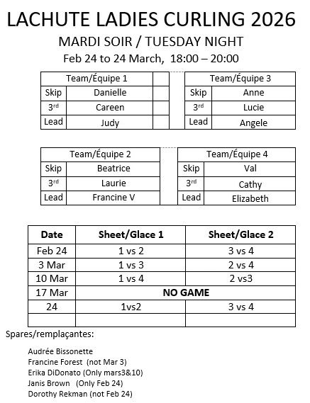 Bienvenue au Club de curling féminin de Lachute, un groupe de femmes enthousiastes qui aiment jouer au curling depuis 1919. Nous sommes le seul groupe de curling féminin au Québec en activité depuis 100 ans. Venez vous joindre a nous que vous soyez novice ou joueuse endurcie. Nous jouons