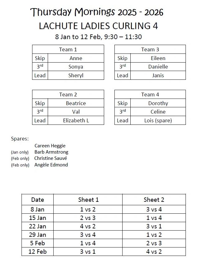 les mardis soir et les jeudis matin. Nous sommes un groupe qui aiment l'exercice, la camaraderie et les défis du curling. Veuillez contacter Lois Finch pour plus d'informations.