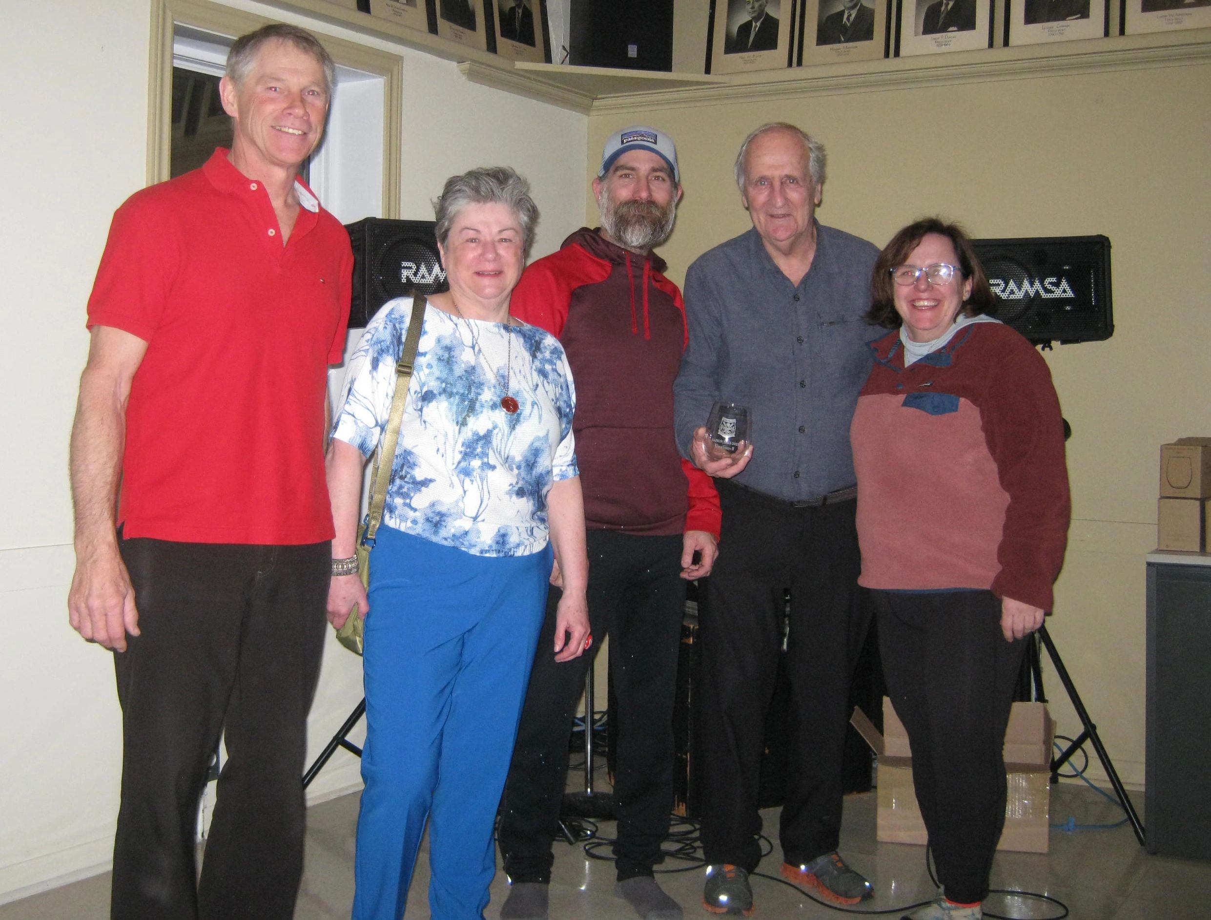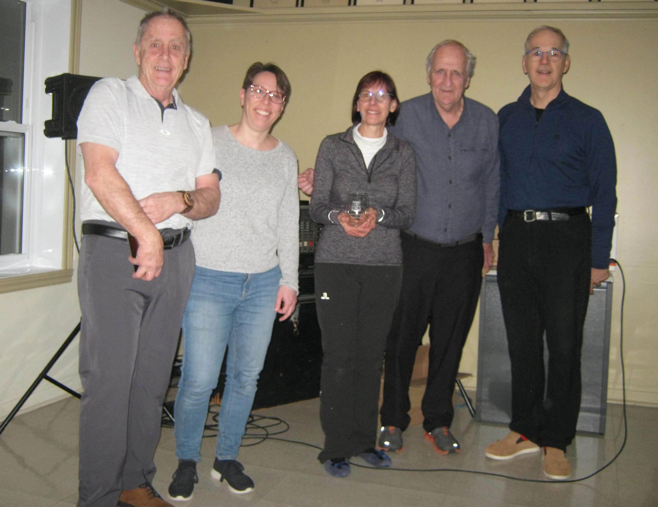 L'équipe gagnante de la journée de plaisirs: Donald Kerr, Bill Mackimmie, Micheline Lemay et Ryan Leggett accompagnée du président du Club, Robert Lemay. Fun Day winning team: Donald Kerr, Bill Mackimmie, Micheline Lemay et Ryan Leggett with Club's President Robert Lemay